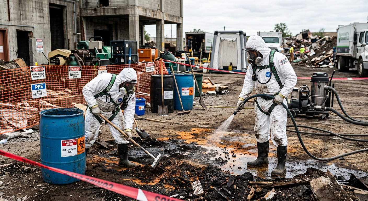 Retrait sécuritaire de matériaux amiantés selon les normes CNESST. Équipes en scaphandre.