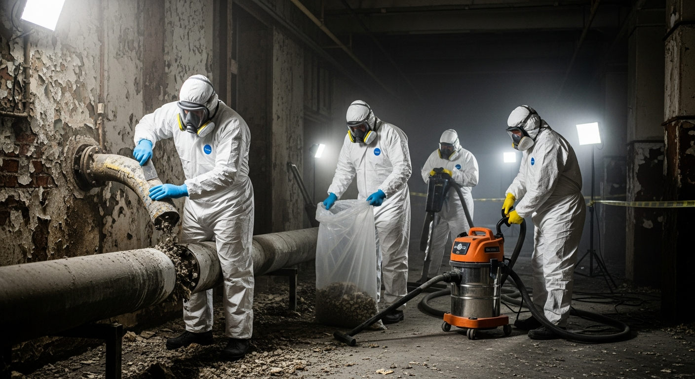 Retrait sécuritaire de matériaux amiantés selon les normes CNESST. Équipes en scaphandre.
