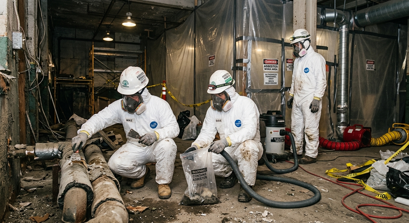 Retrait sécuritaire de matériaux amiantés selon les normes CNESST. Équipes en scaphandre.