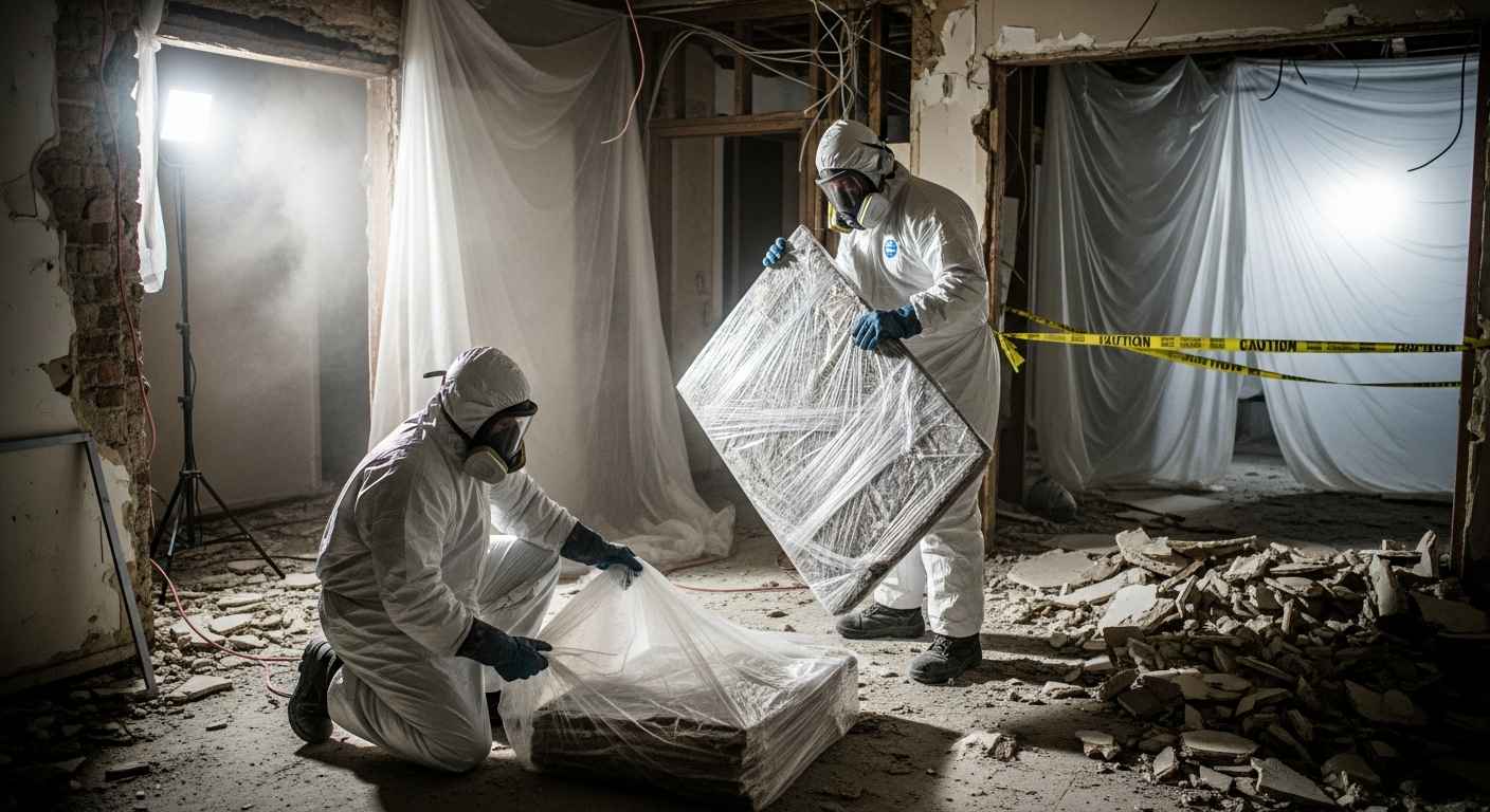Retrait sécuritaire de matériaux amiantés selon les normes CNESST. Équipes en scaphandre.