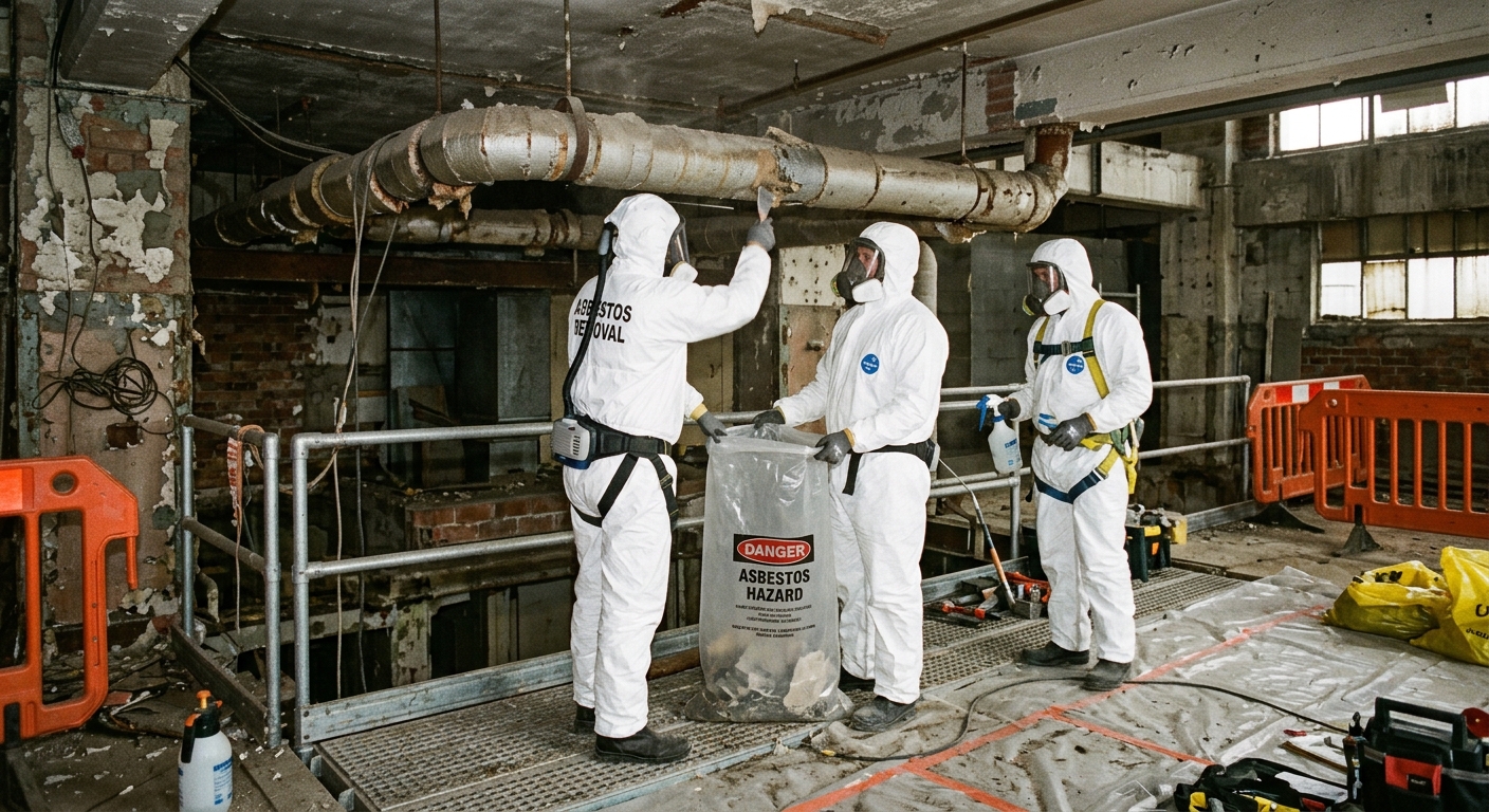 Retrait sécuritaire de matériaux amiantés selon les normes CNESST. Équipes en scaphandre.