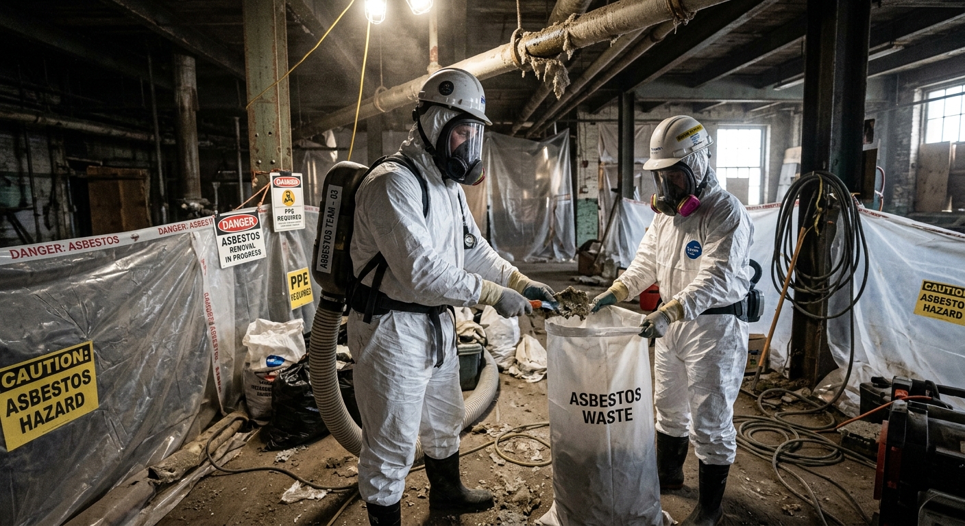 Retrait sécuritaire de matériaux amiantés selon les normes CNESST. Équipes en scaphandre.