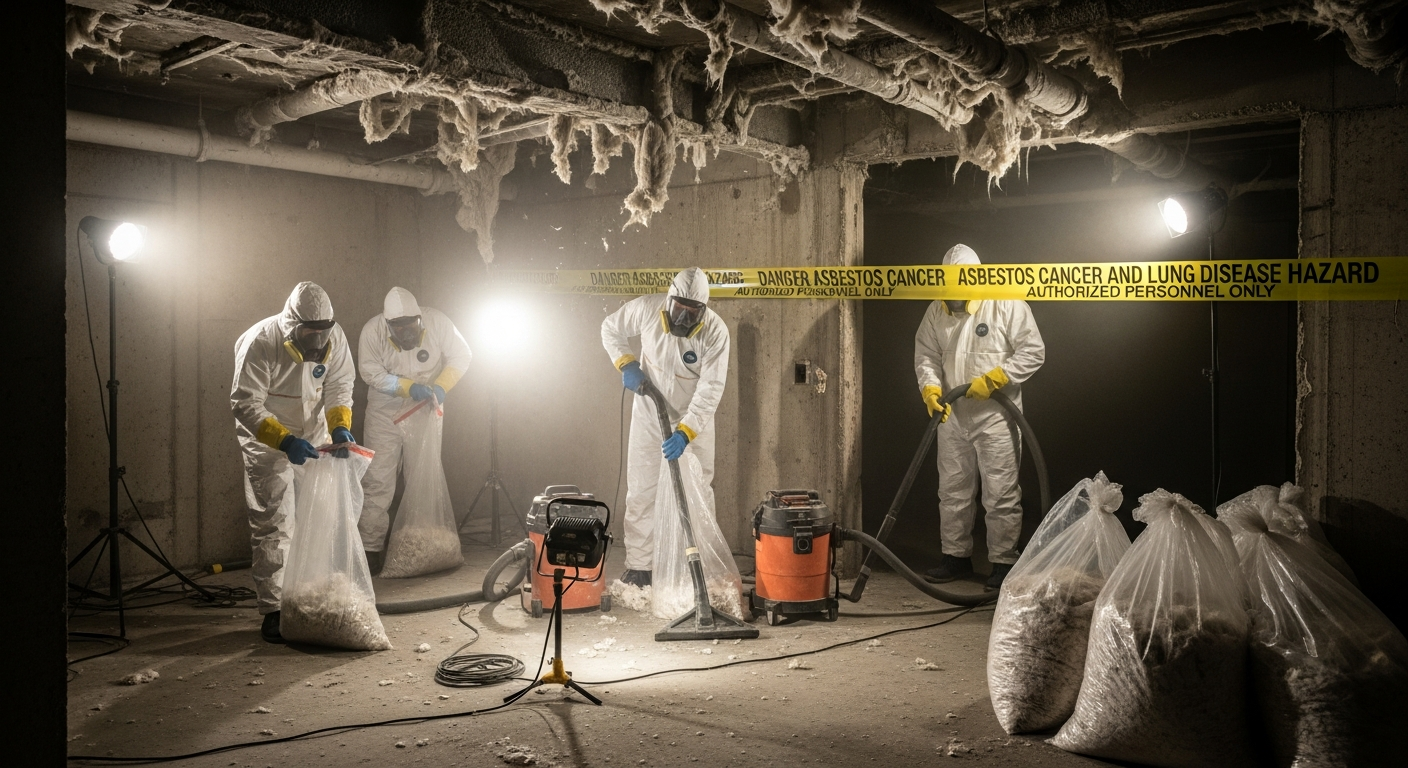 Retrait sécuritaire de matériaux amiantés selon les normes CNESST. Équipes en scaphandre.