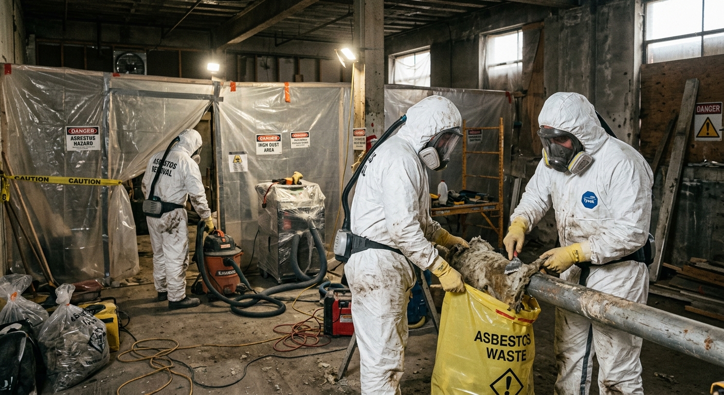 Retrait sécuritaire de matériaux amiantés selon les normes CNESST. Équipes en scaphandre.