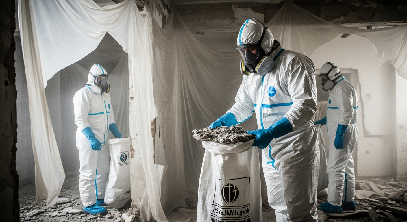 Retrait sécuritaire de matériaux amiantés selon les normes CNESST. Équipes en scaphandre.